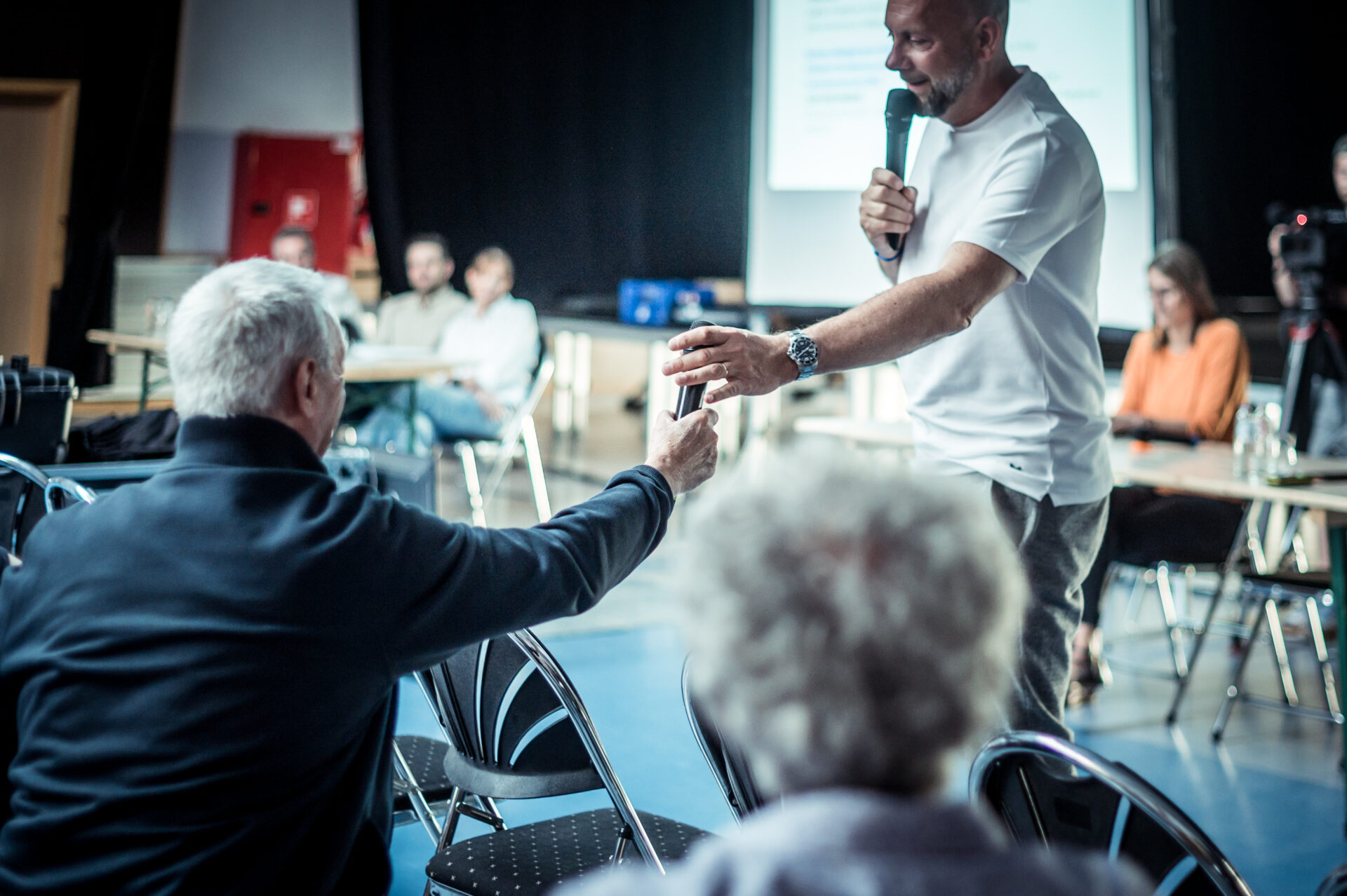 Il se place dans la salle, parmi les participants, pleinement présent au cœur du débat.